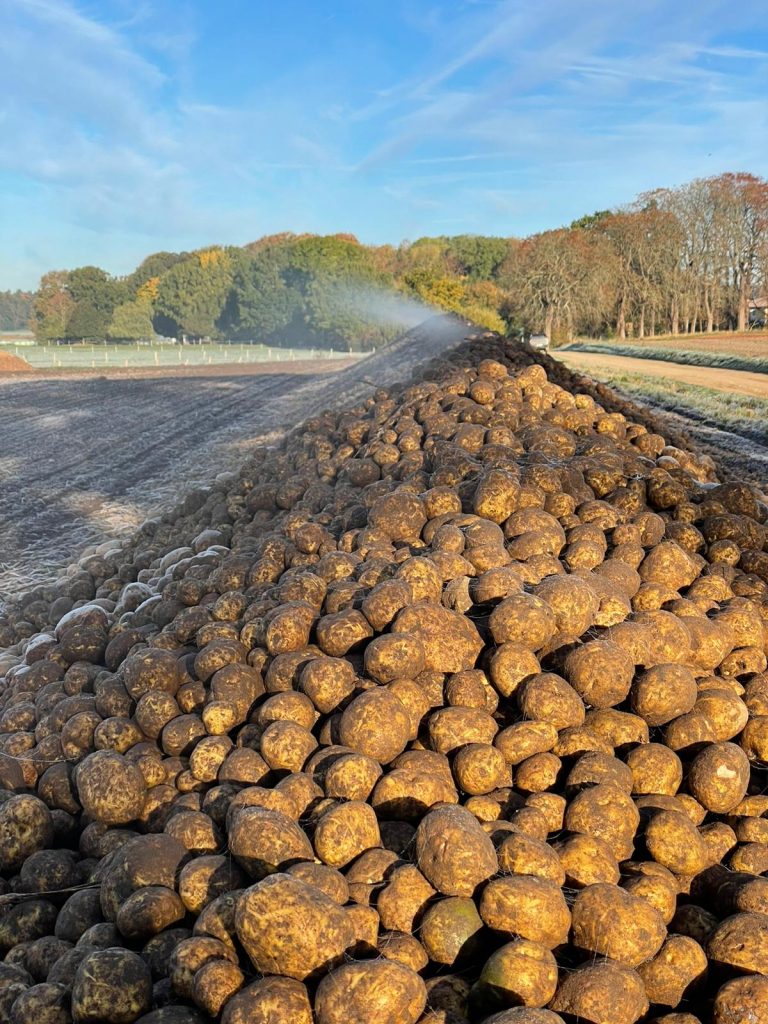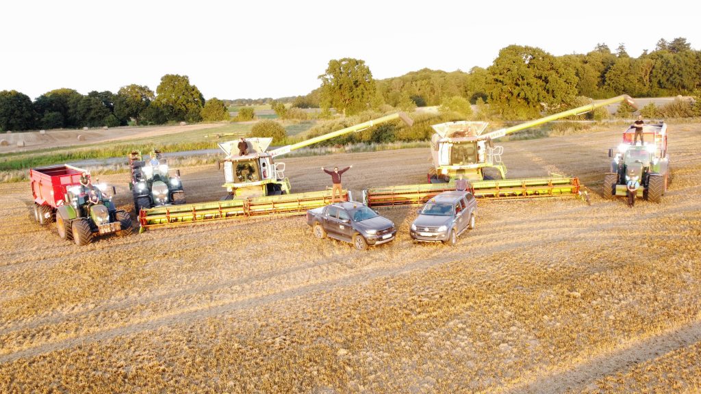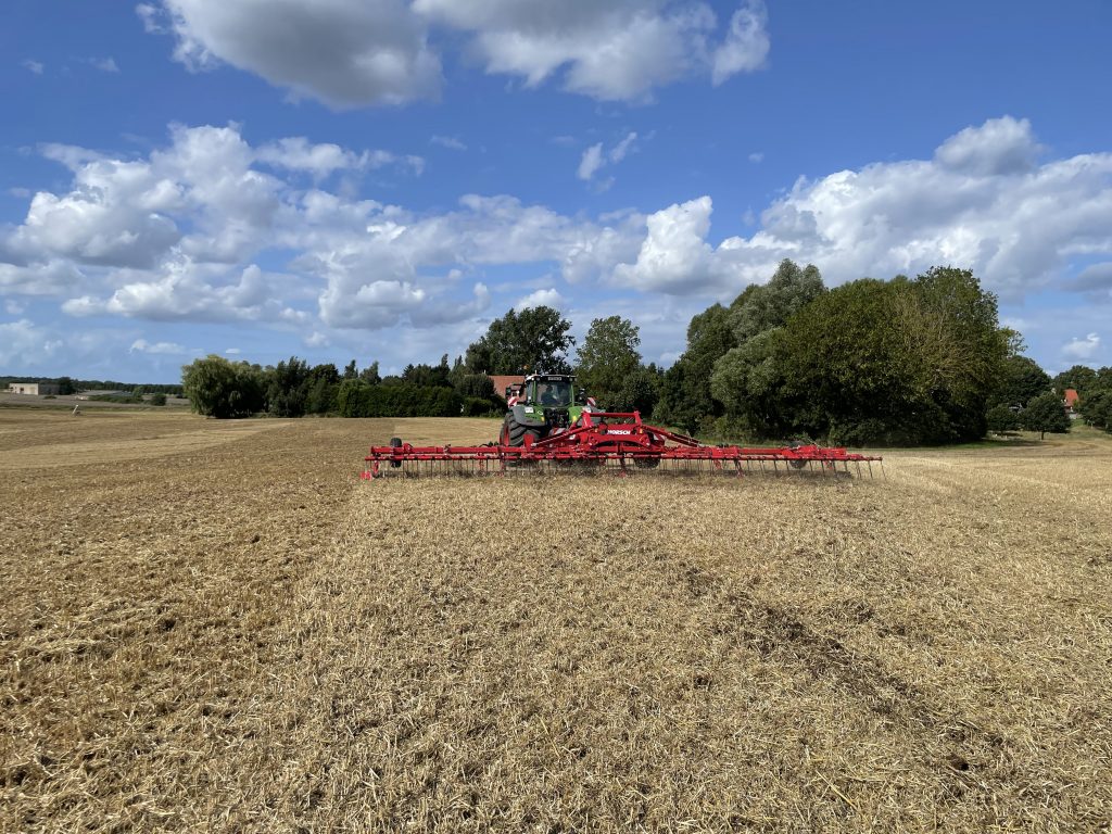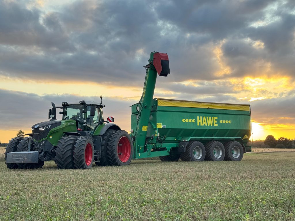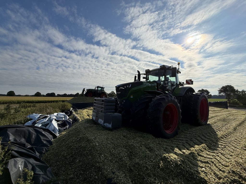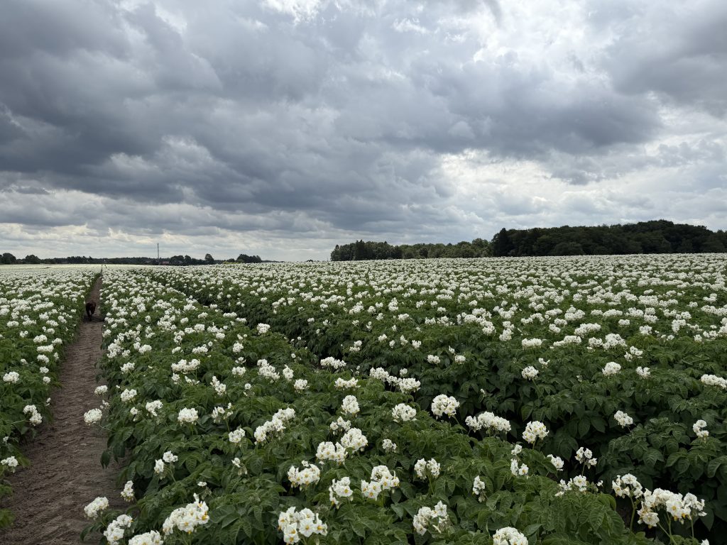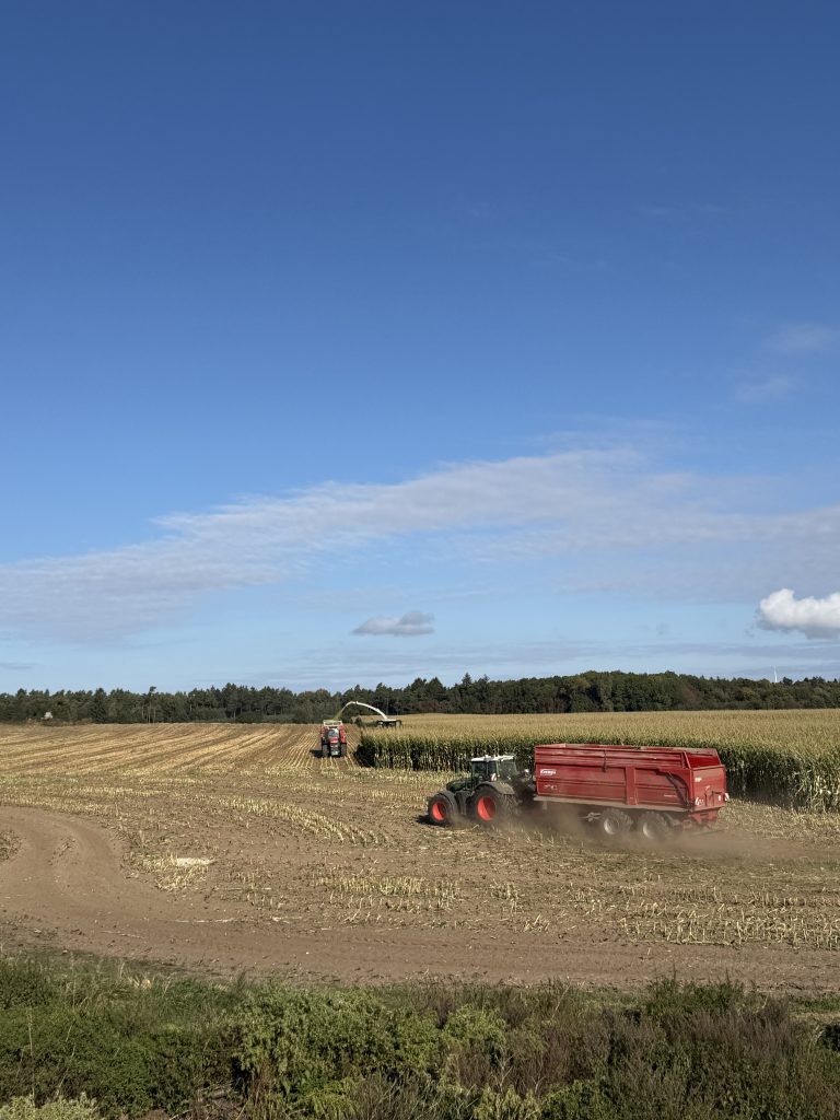 Auf ca. 1.700 ha Fläche ernten wir ca. 32dt/ha Raps, 67dt/ha Weizen, 73dt/ha Triticale, 760dt/ha Zuckerrüben und 400dt/ha Silomais. Zusätzlich roden wir seit 2024 ca. 425dt/ha Kartoffeln. Dabei achten wir auf Gewässerschutz, Rand- und Blühstreifen, sowie Brache, konservierenden Ackerbau und die Pflege von Landschaftselementen. Zudem überfliegen wir die Felder mit Drohnen vor der Mahd, um sicherzugehen, dass keine Rehkitze darin versteckt sind.